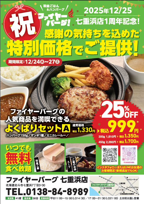 12/25を持ちまして「ファイヤーバーグ七重浜店」はオープン1周年を迎えます。